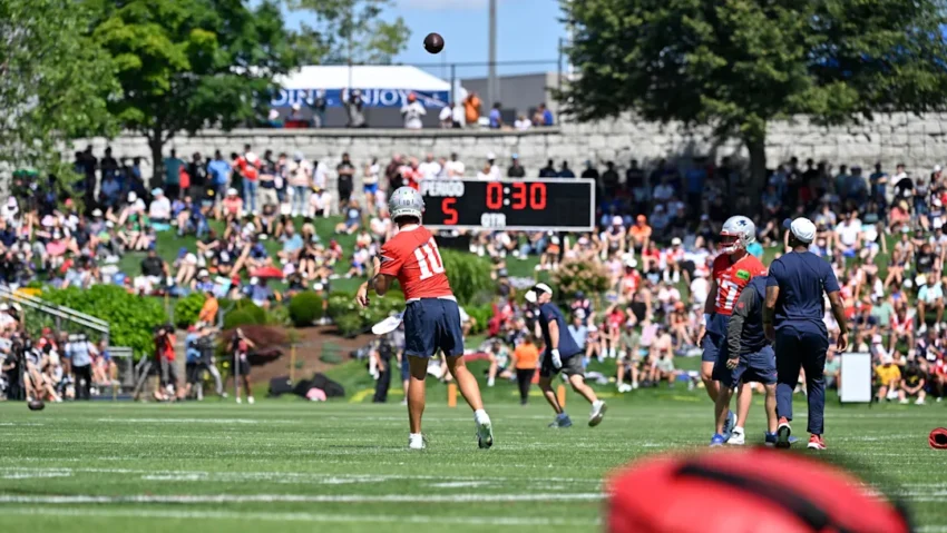 During an 11-on-11 period of their fourth training camp practice in Foxborough on Saturday, second-year signal-caller Drake Maye avoided pressure from his left, scrambled to the right, and—while off-platform—was able to find wide-open wide receiver DeMario Douglas for a touchdown.