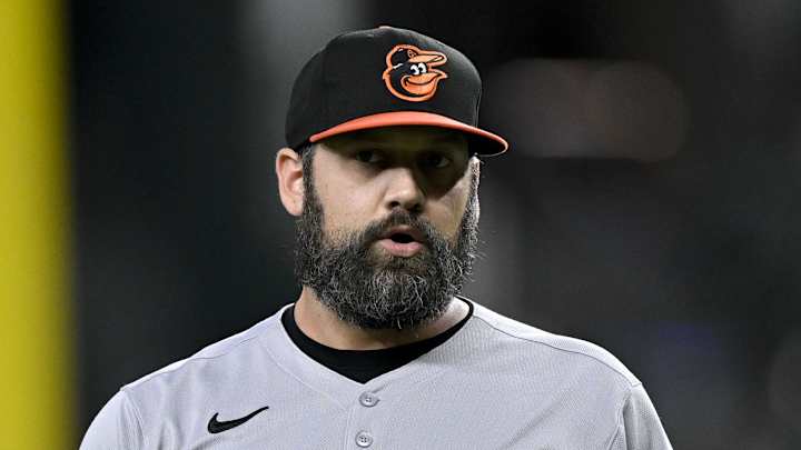 Former Baltimore Orioles relief pitcher Andrew Kittredge (39) against the Texas Rangers at Globe Life Field in 2025 before being traded to the Cubs